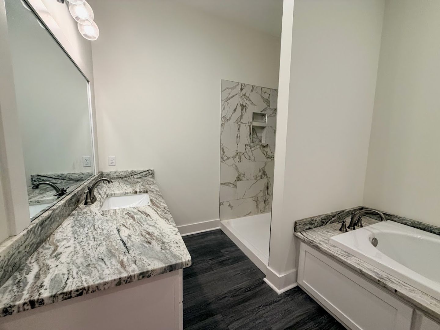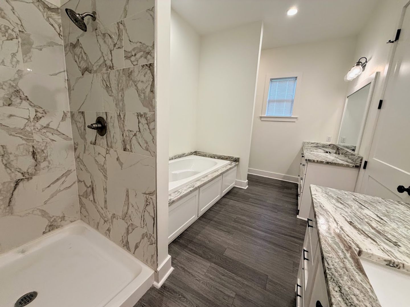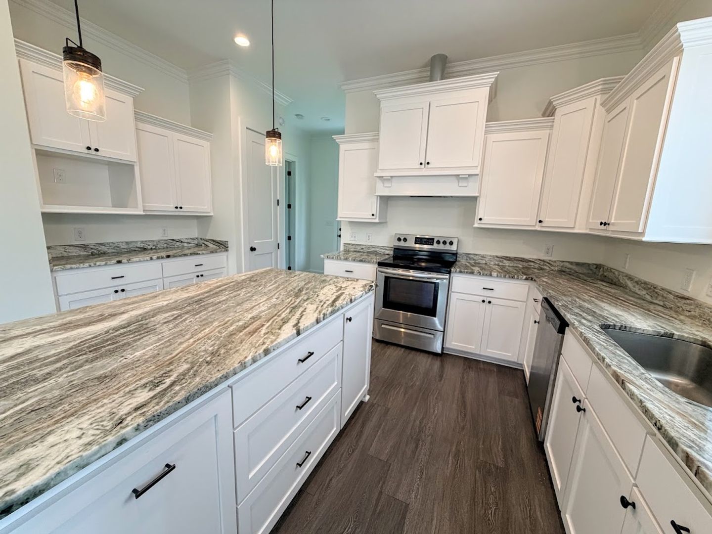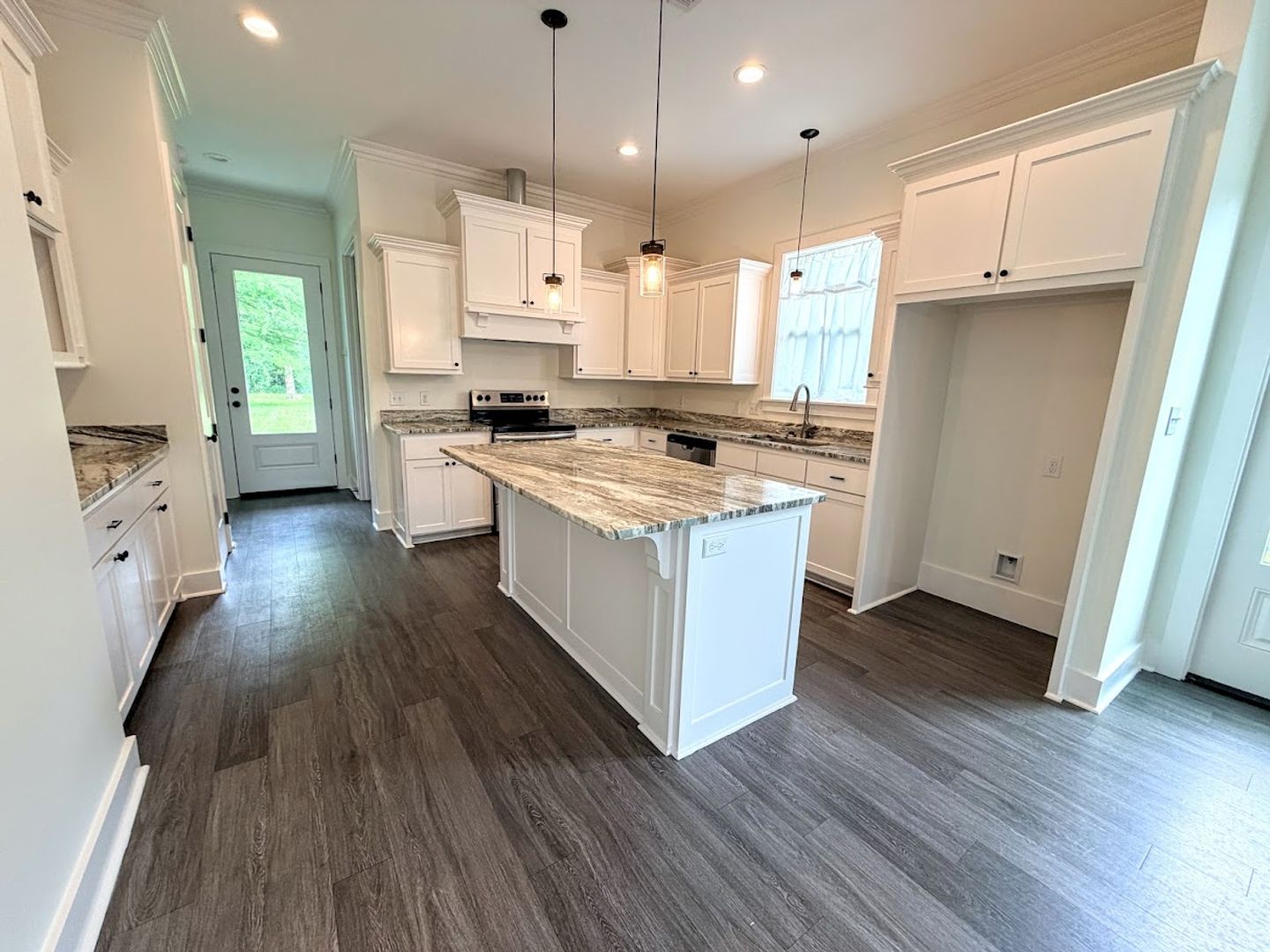 The kitchen is a standout feature with granite countertops, custom cabinetry, stainless steel appliances, a large island, and recessed LED lighting. The primary suite includes a walk-in closet with ample storage, double vanity, a 6-foot garden tub, and a separate walk-in shower.